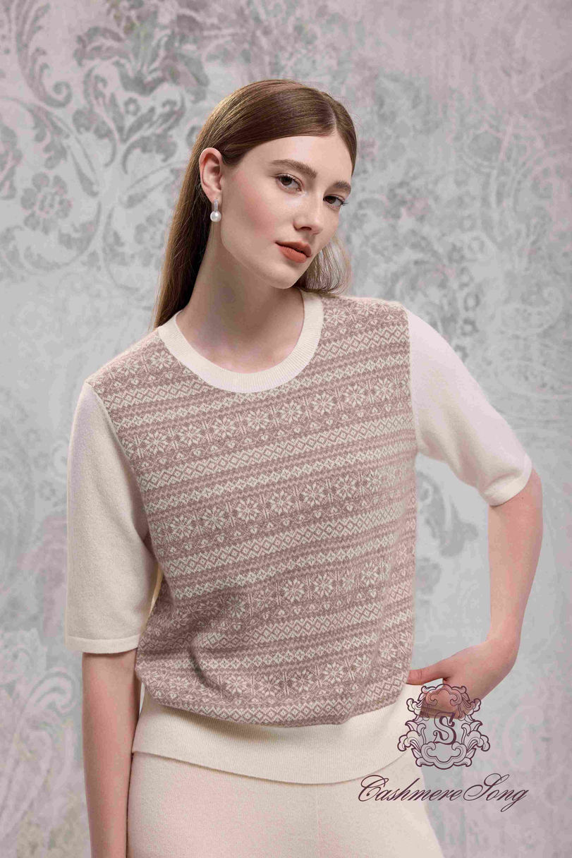 A crewneck sweater with an off-white base scattered with low-saturation snowflake and geometric Fair Isle motifs, evoking classic Nordic winter scenes. Drop-shoulder, elbow-length sleeves keep the look laid-back, whether layered over a shirt or worn on its own. A lightly cinched hem and resilient ribbed crew neckline retain their shape wash after wash.