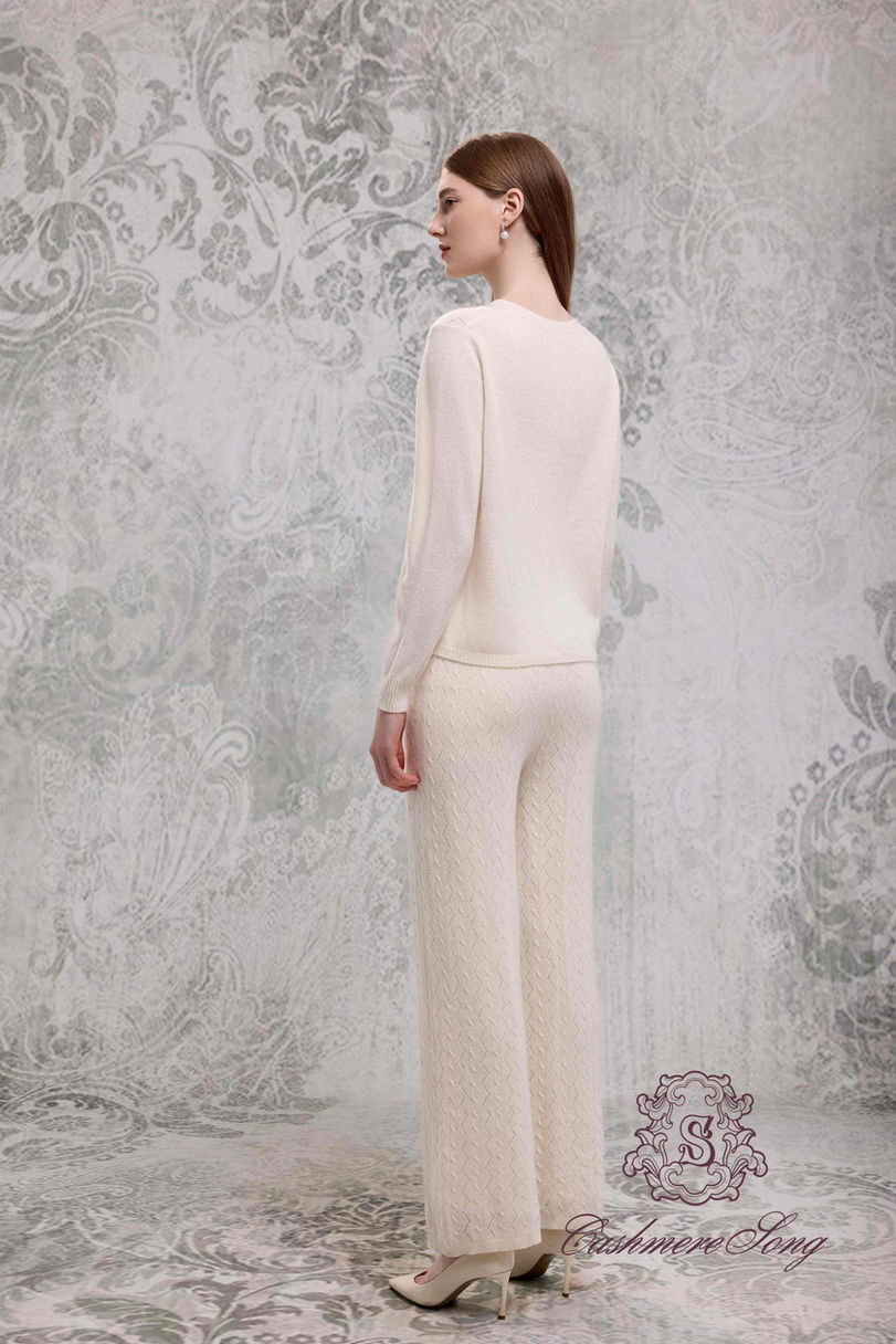 A small crewneck knit in an H-line that doesn’t cling. The front is finished with symmetrical lace and bead embellishment for understated shine and movement. Asymmetrical openwork at the shoulders keeps the piece light and breathable, with every detail speaking to craftsmanship. Drop shoulders further enhance its relaxed, youthful attitude.