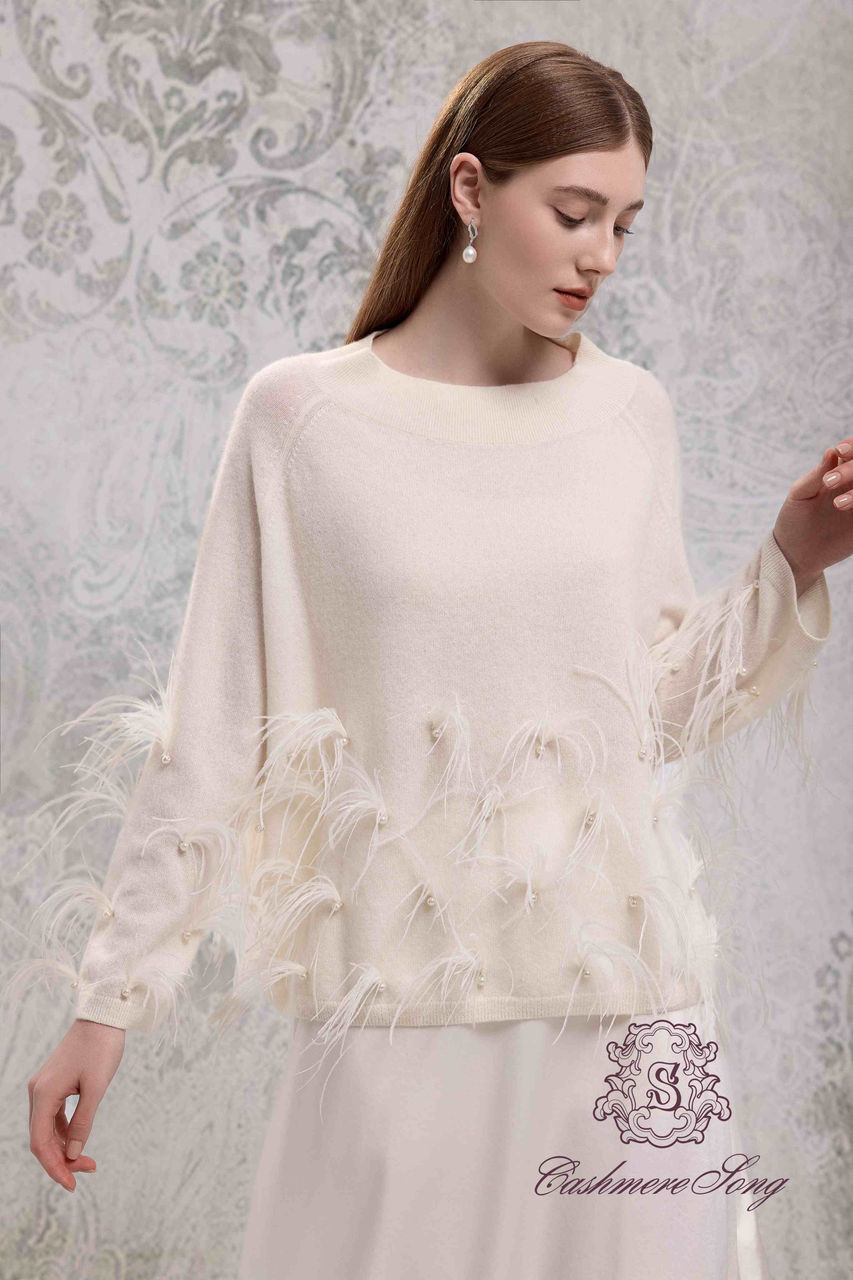 An off-shoulder knit top with feather detailing for a soft, feminine finish. Raglan sleeves and ribbed trim keep the look casual yet stylish. Great for evenings out or adding flair to everyday outfits.