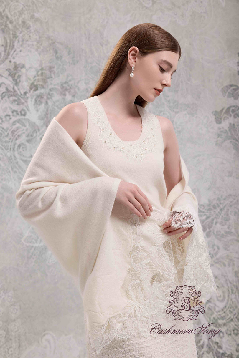 Made with ultra-soft cashmere yarn in a looser, fluffier weave for extra warmth and comfort. Delicate lace panels are seamlessly stitched along both edges, enhancing the scarf’s refined and graceful look. Featuring openwork detailing, this elegant fusion of textures brings out a soft, feminine sophistication.